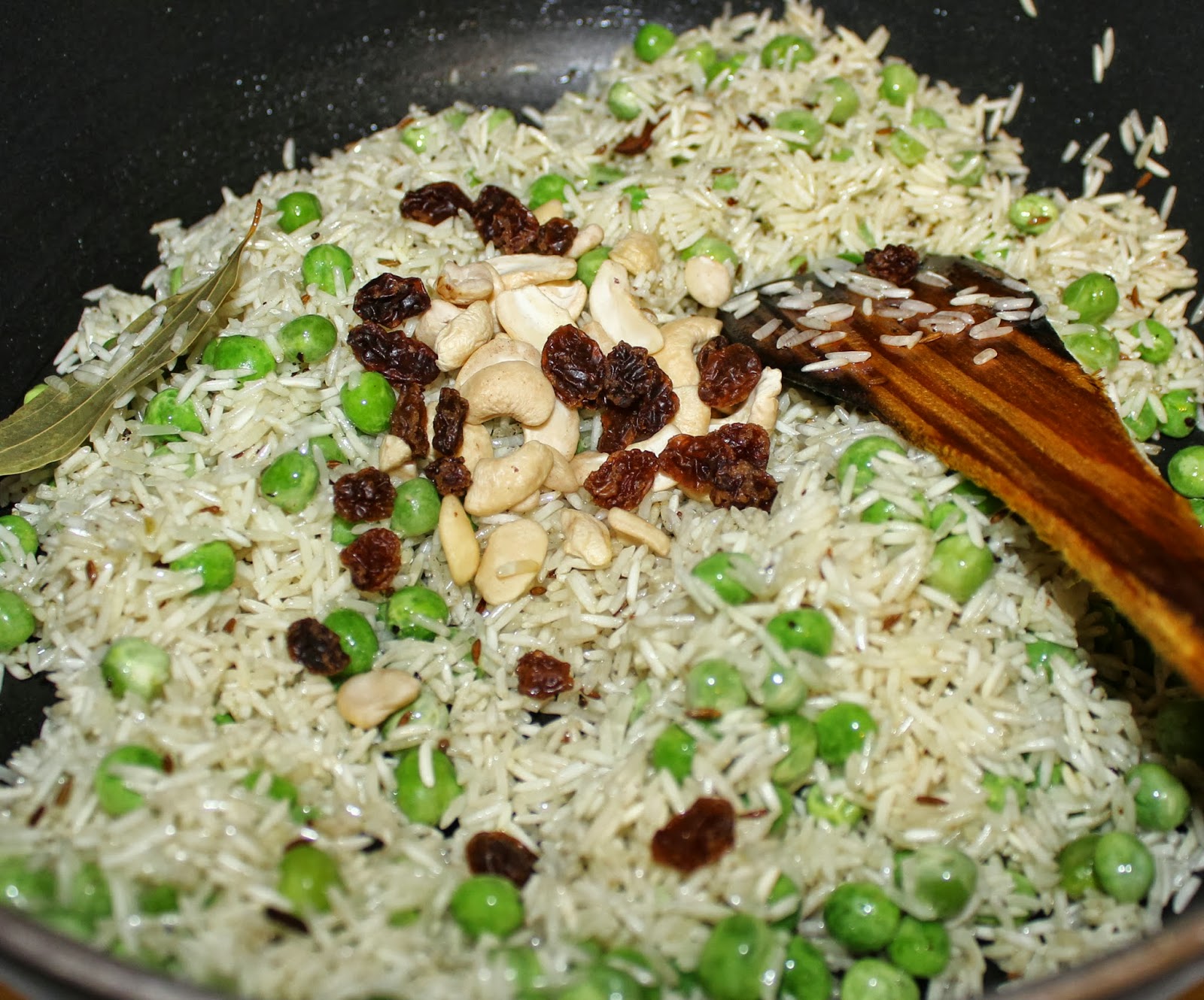 - Add the rice and peas and mix well. Add cashew nut (kaju), raisins (kismis), sugar,salt, cumin powder mix all of the together.